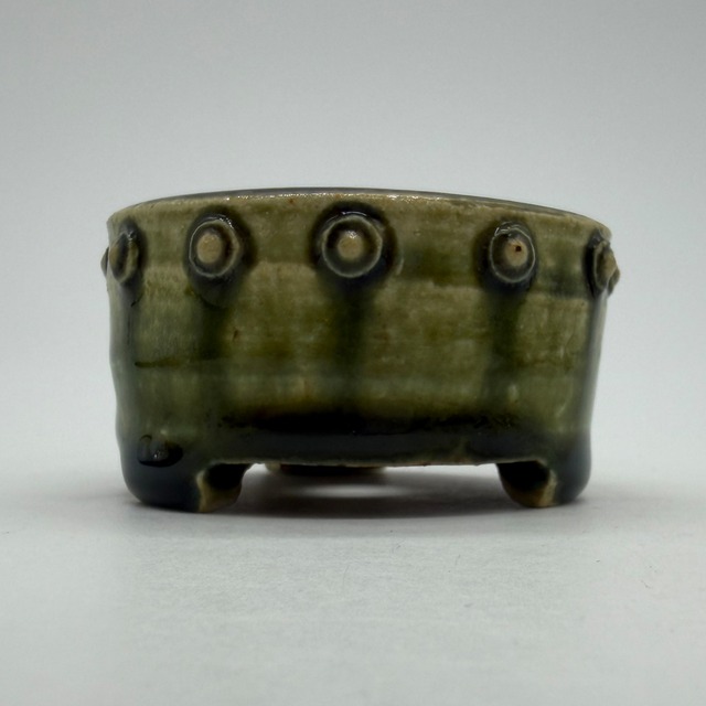 サイズ / Size:(上 内径/ Top Inner)4.5cm/1.8inch (上 外径/ Top Outer)5.5cm /2.2inch (高さ/H)3.0cm/1.2inch 小品盆栽(ミニ盆栽)用 / for Mini BONSAI 陶器製 / Ceramic 手作り / Handmade 作家 / Artist:加藤竜弥 / Tatsuya Kato 製造:愛知県瀬戸市 / Made in Japan (Seto city) 呂宋をまるごと楽しむ「RUSU BONSAI POT」。シンプルな形ですが、側面の模様が盆栽の存在を際立てます。在庫は1つ限りです。この深い緑色は「呂宋」という焼き物の代表的な色で、浮世絵にみられる呂宋もこの色だし、「呂宋」を検索して出てくるのもこの色。見れば見るほど気になる魅惑の色。 緑釉は「織部焼き」がポピュラーですが、呂宋で使用する緑釉は織部の緑釉とは成分の配合が異なり区別されています。 呂宋に特徴的な模様(貼花文)。この鉢では太鼓の鋲のような飾りがついていますが、全て手作業で装飾されています。 江戸時代の人に広く愛された「呂宋」。自宅に「江戸時代を感じる」特別な空間を作ってみませんか?昭和レトロをはるかに超える! ☆「貼花文」と呼ばれる立体的な模様は、江戸時代に愛知県瀬戸市で広まった「呂宋」と呼ばれる焼き物の特徴の1つです。「呂宋」は当時とても人気の焼き物で、喜多川歌麿の浮世絵にも描かれています。 ※1点1点手作業で作った作品ですので、鉢のサイズや釉薬のかかり具合など均一ではありません。多少の歪みがある場合もございます。ご理解の上、ご検討ください。 “RUSU BONSAI Pot” to directly enjoy the traditional color and the technique. Simple shape but the side pattern highlights the presence of your BONSAI. Only one pot in stock. This deep green color is a typical color for RUSU pottery. This is the color of RUSU seen in UKIYO-E prints, and it is also this color that comes up when you search for RUSU. So enchanting color that the more you look at it, the more you like it. For green glaze, ‘ORIBE’ is popular in our place (Seto city). The green glaze used in our ‘RUSU’ is distinguished from ORIBE green glaze in a different composition of ingredients. The drum-tack like decorations (CHO KA MON) on this BONSAI pot were all handmade, placed one by one. “RUSU”, widely loved by the people of the EDO period. Why don’t you create special space in your home where you can feel the EDO period. ☆ The pattern called "CHO KA MON" is one of the characteristics of the pottery called "RUSU", which was widespread in Seto City, Aichi Prefecture during the Edo period. "RUSU" was a very popular pottery at the time, and it is also depicted in the ukiyo-e prints of Kitagawa Utamaro. 【notes】 Since it is a work made by hand one by one, the size of the pot and the degree of glaze are not uniform. There may be some distortion.
