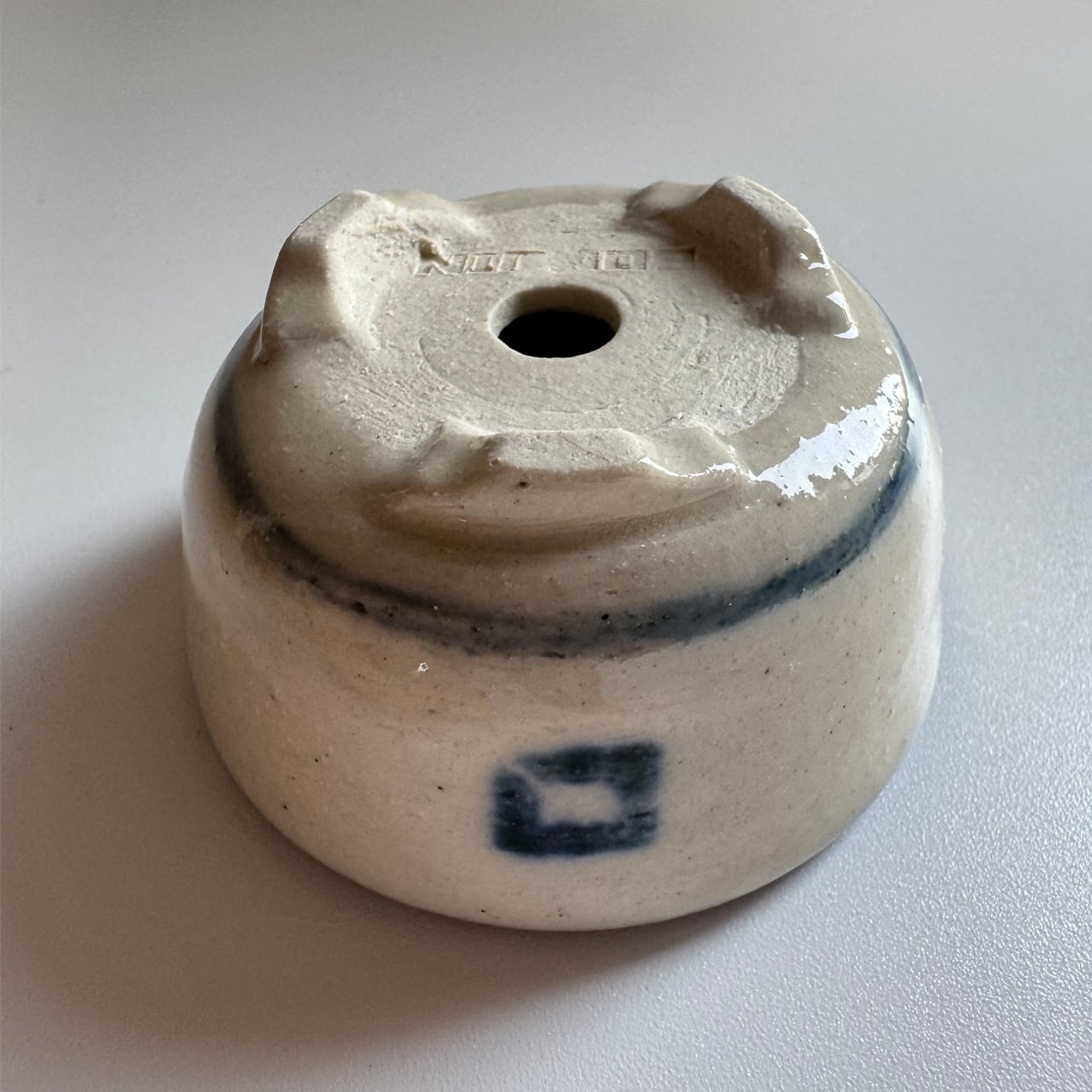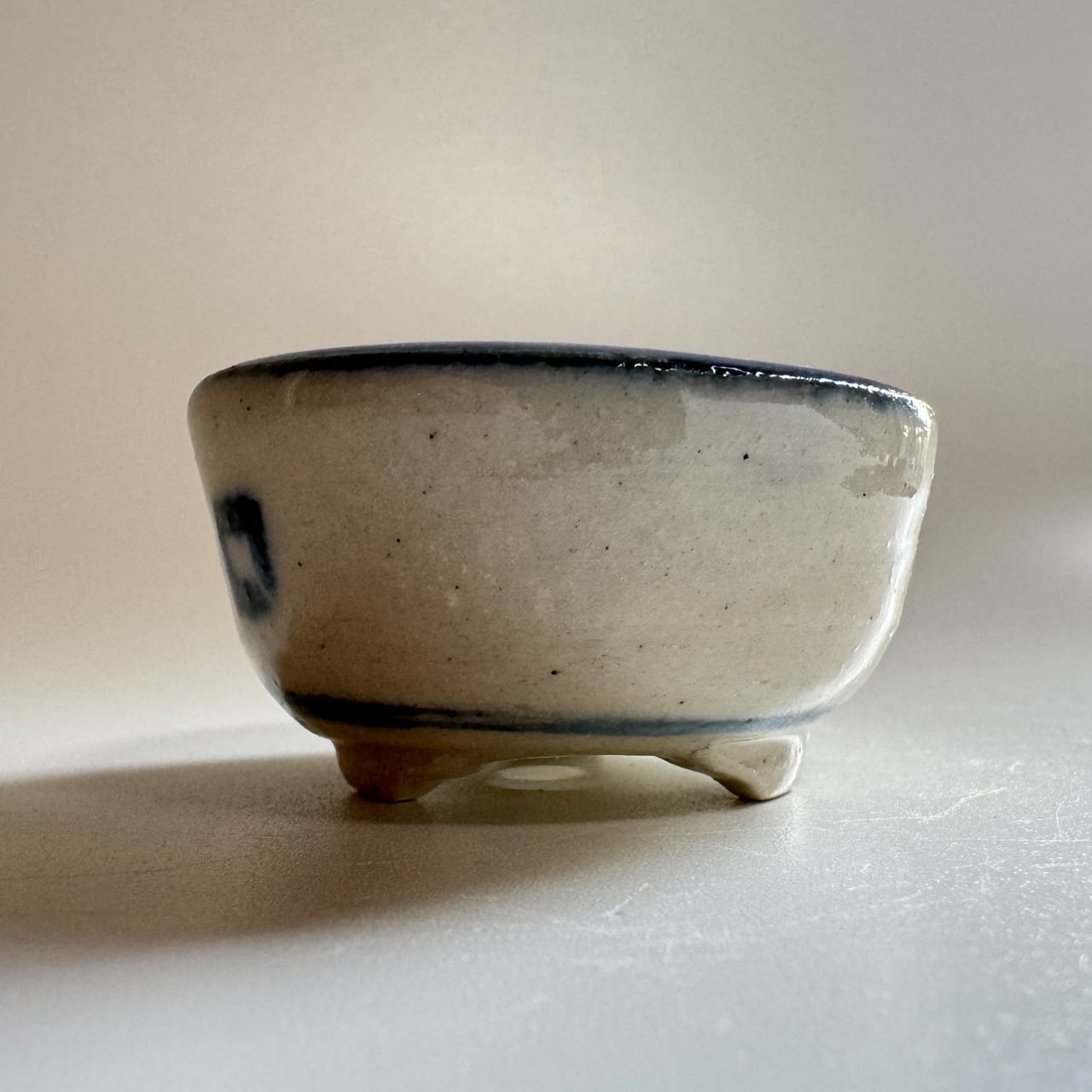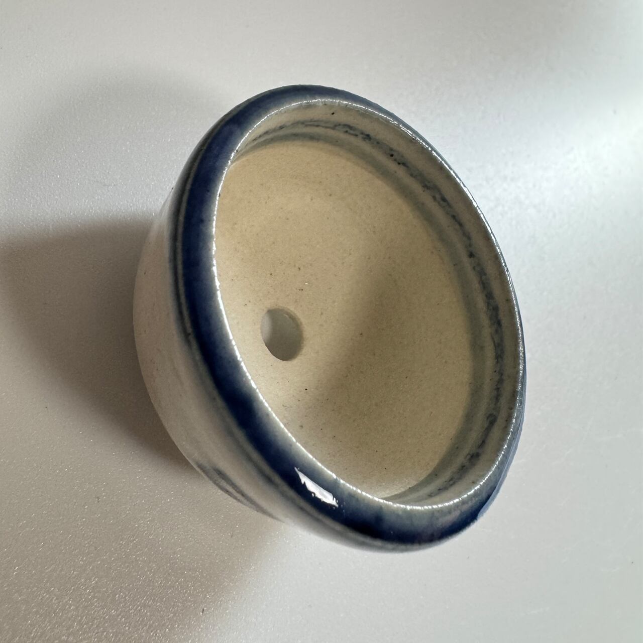 藍のシリーズ。焼いたあとに一回り小さくなるとはいえ、排水を考えて穴に向けて緩やかなカーブのある鉢を手作りする時の指先の緊張感を想像してみて欲しい一品です。鉢の表面をよく見てみると、ろくろ成形の跡があります。