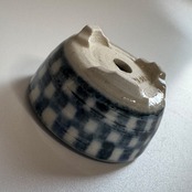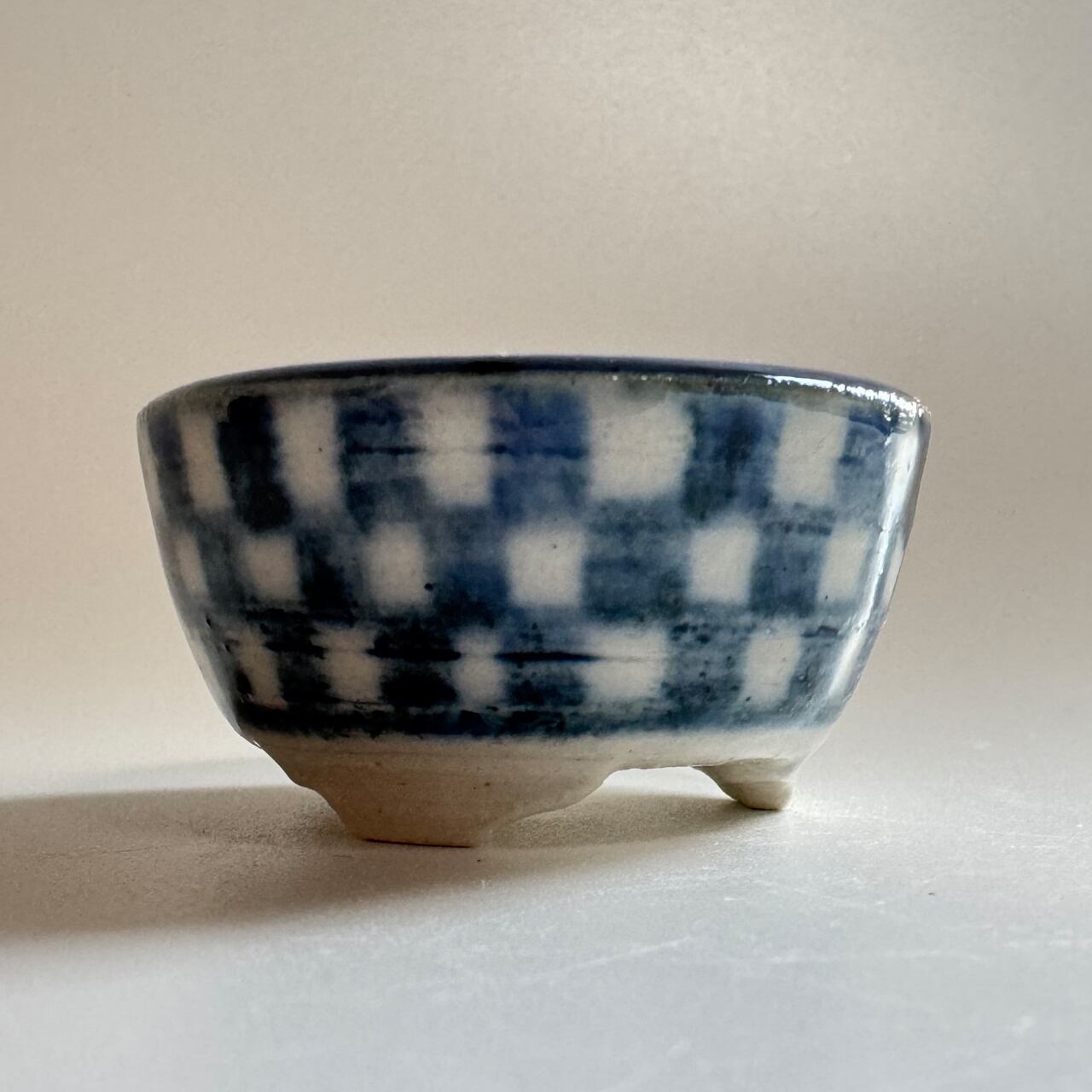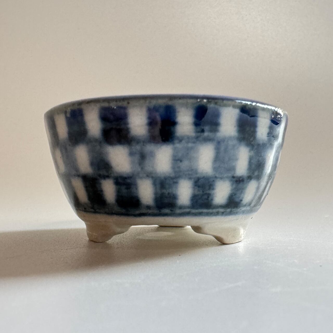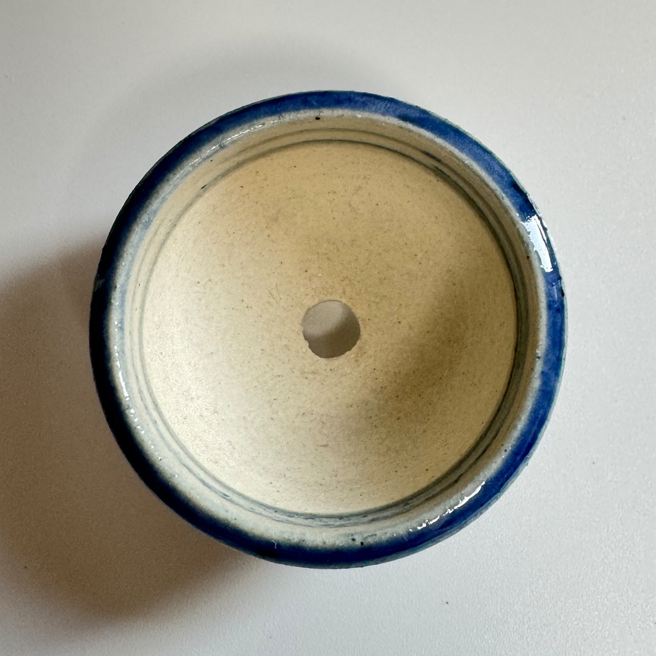 藍のシリーズ。焼いたあとに一回り小さくなるとはいえ、排水を考えて穴に向けて緩やかなカーブのある鉢を手作りする時の指先の緊張感を想像してみて欲しい一品です。鉢の表面をよく見てみると、ろくろ成形の跡があります。