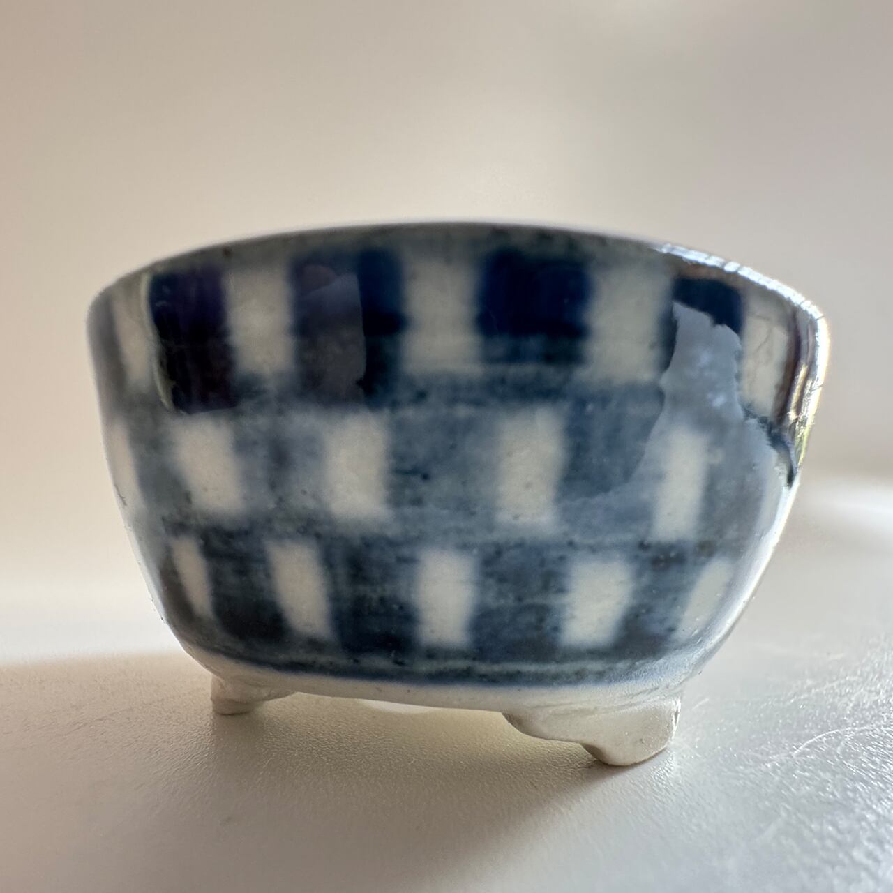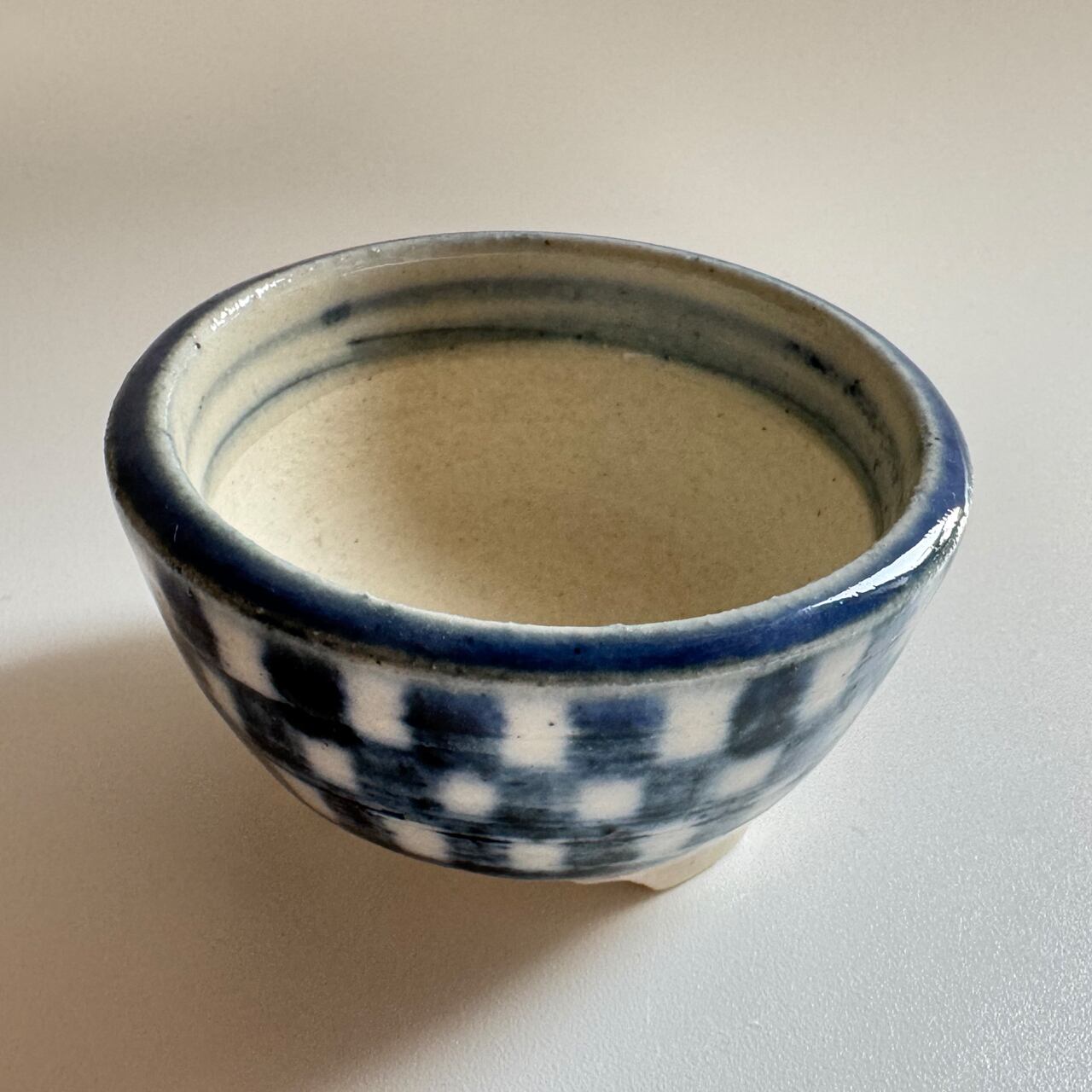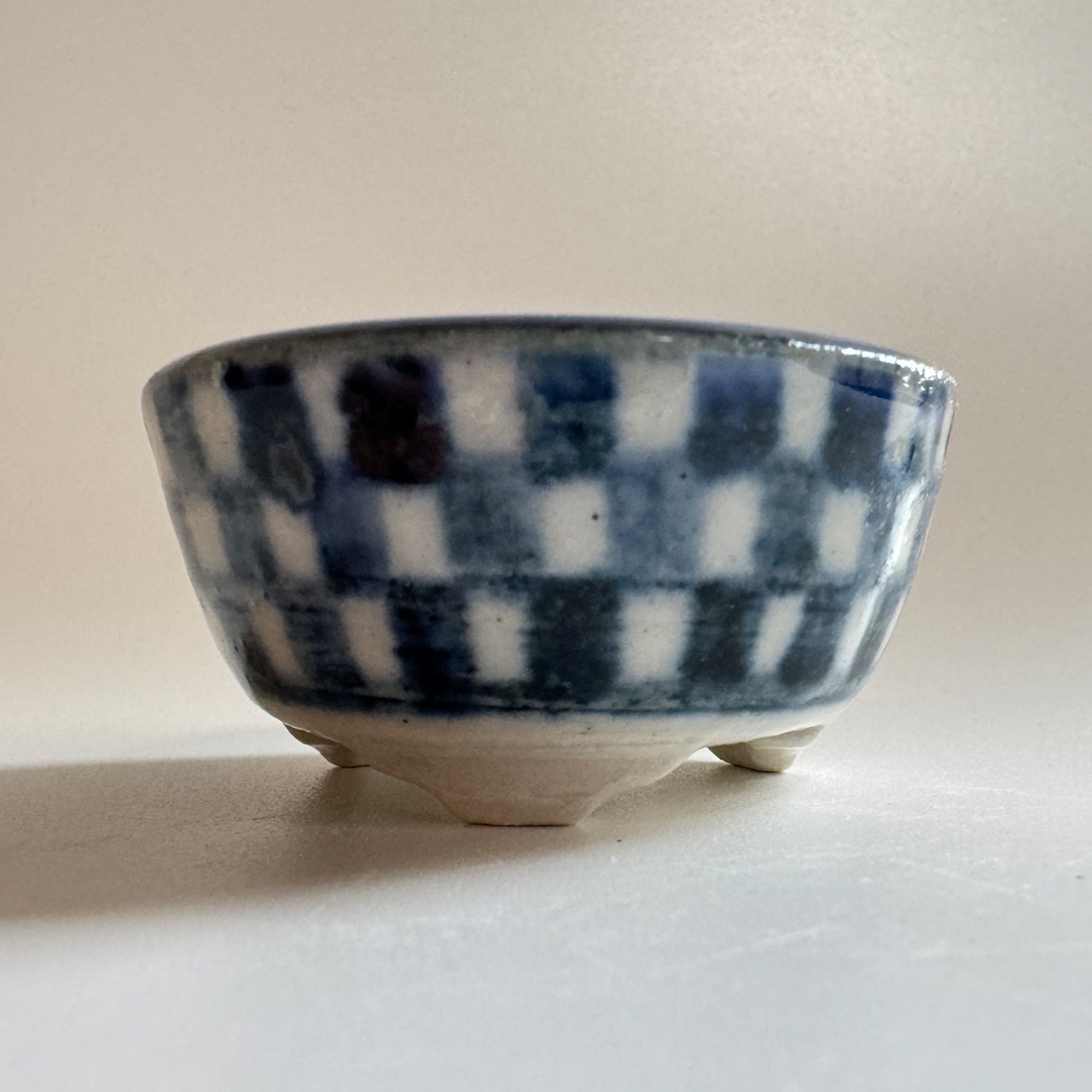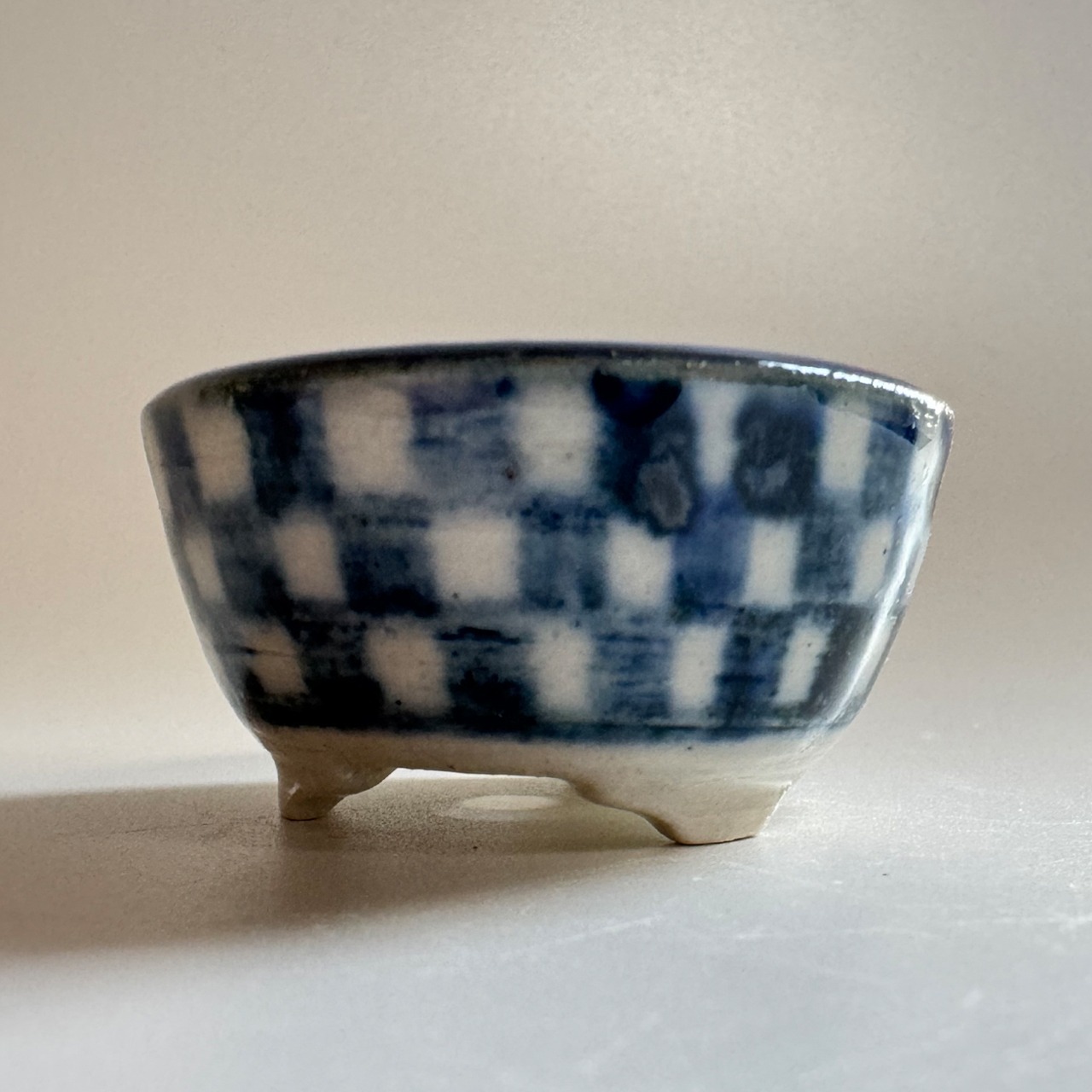 藍のシリーズ。焼いたあとに一回り小さくなるとはいえ、排水を考えて穴に向けて緩やかなカーブのある鉢を手作りする時の指先の緊張感を想像してみて欲しい一品です。鉢の表面をよく見てみると、ろくろ成形の跡があります。