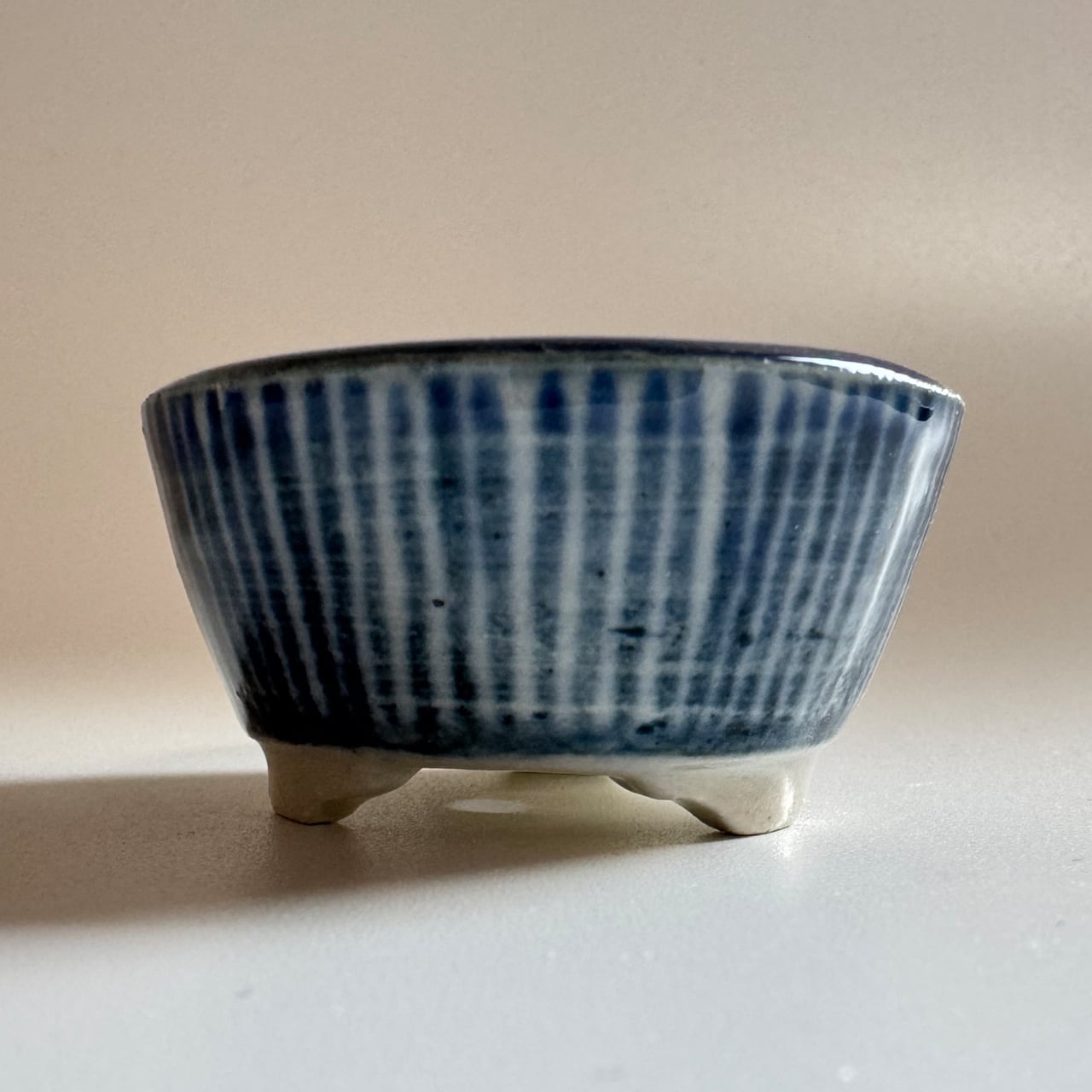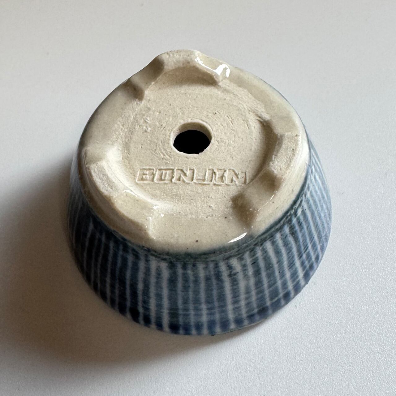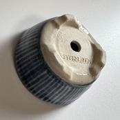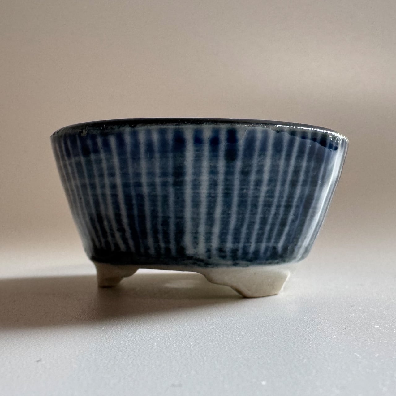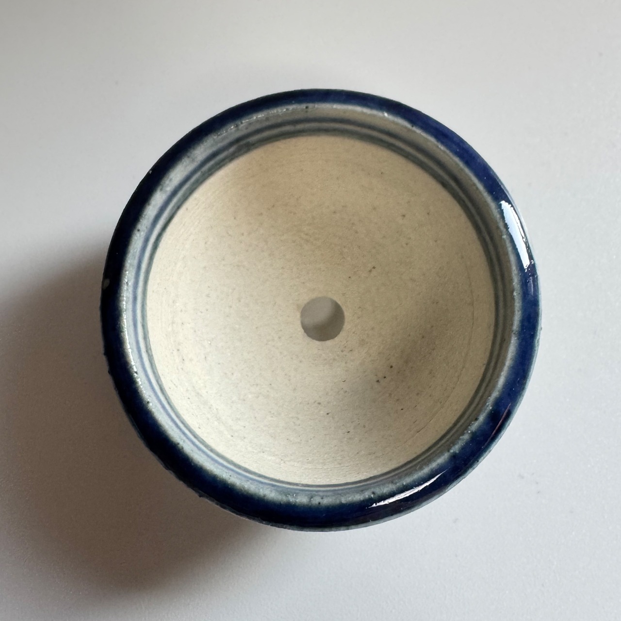 藍のシリーズ。焼いたあとに一回り小さくなるとはいえ、排水を考えて穴に向けて緩やかなカーブのある鉢を手作りする時の指先の緊張感を想像してみて欲しい一品です。鉢の表面をよく見てみると、ろくろ成形の跡があります。