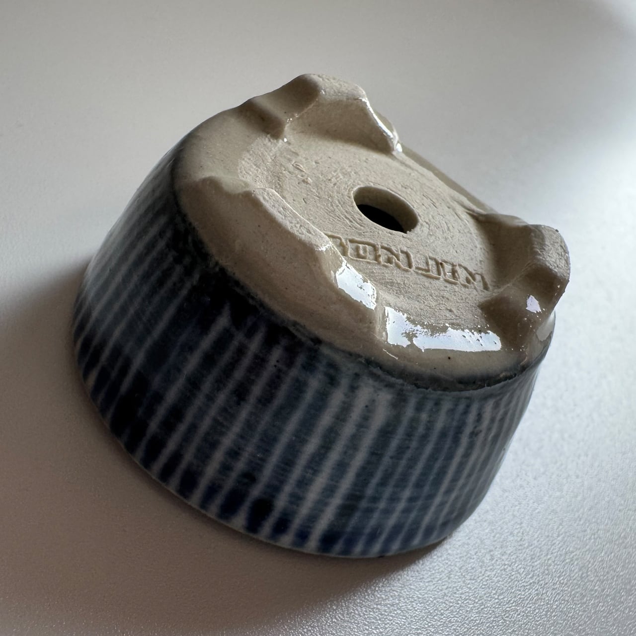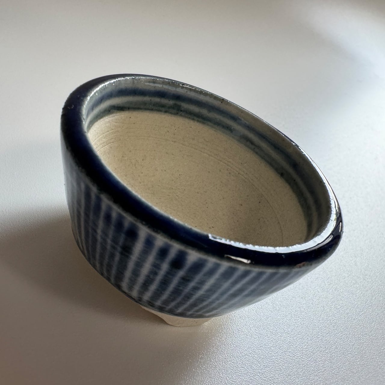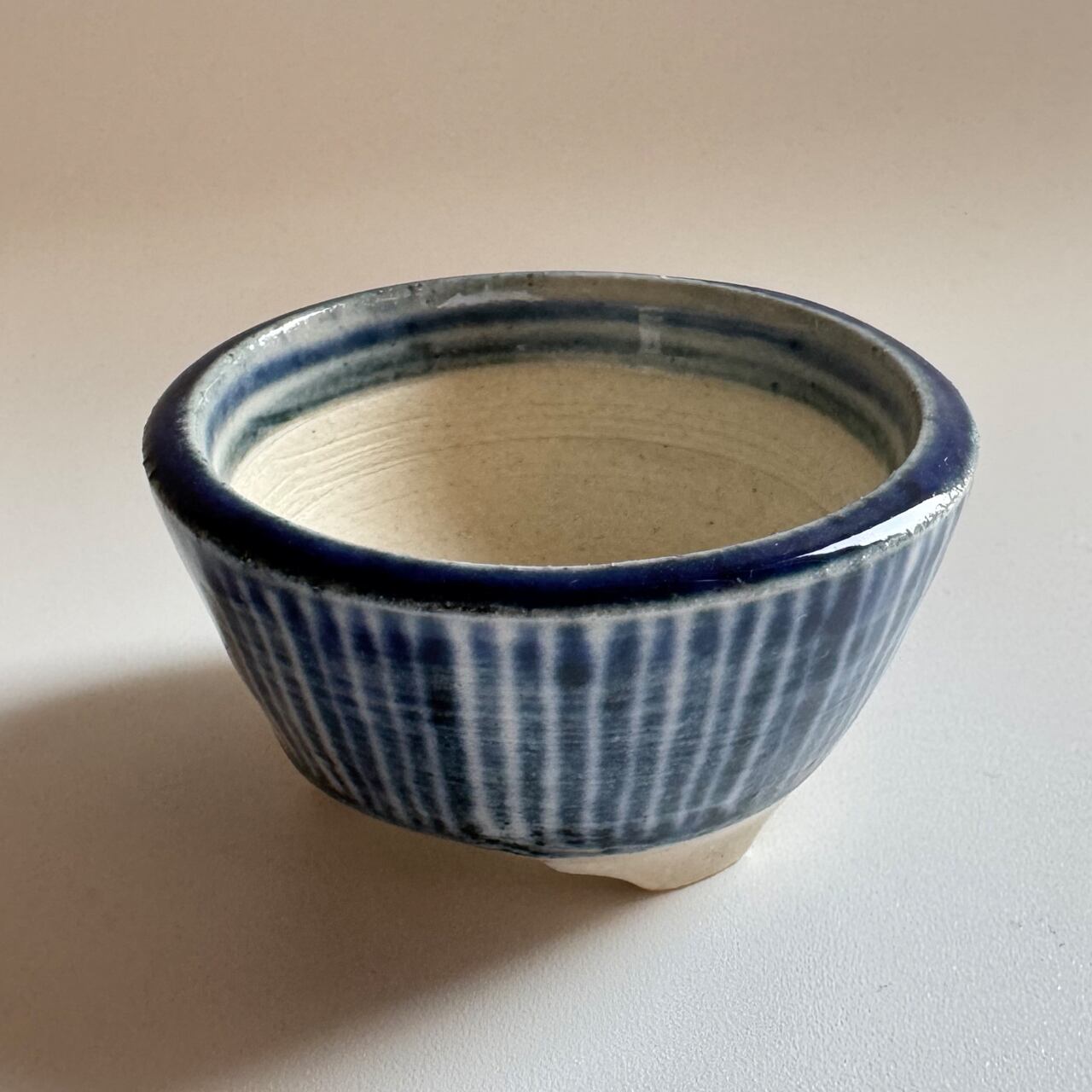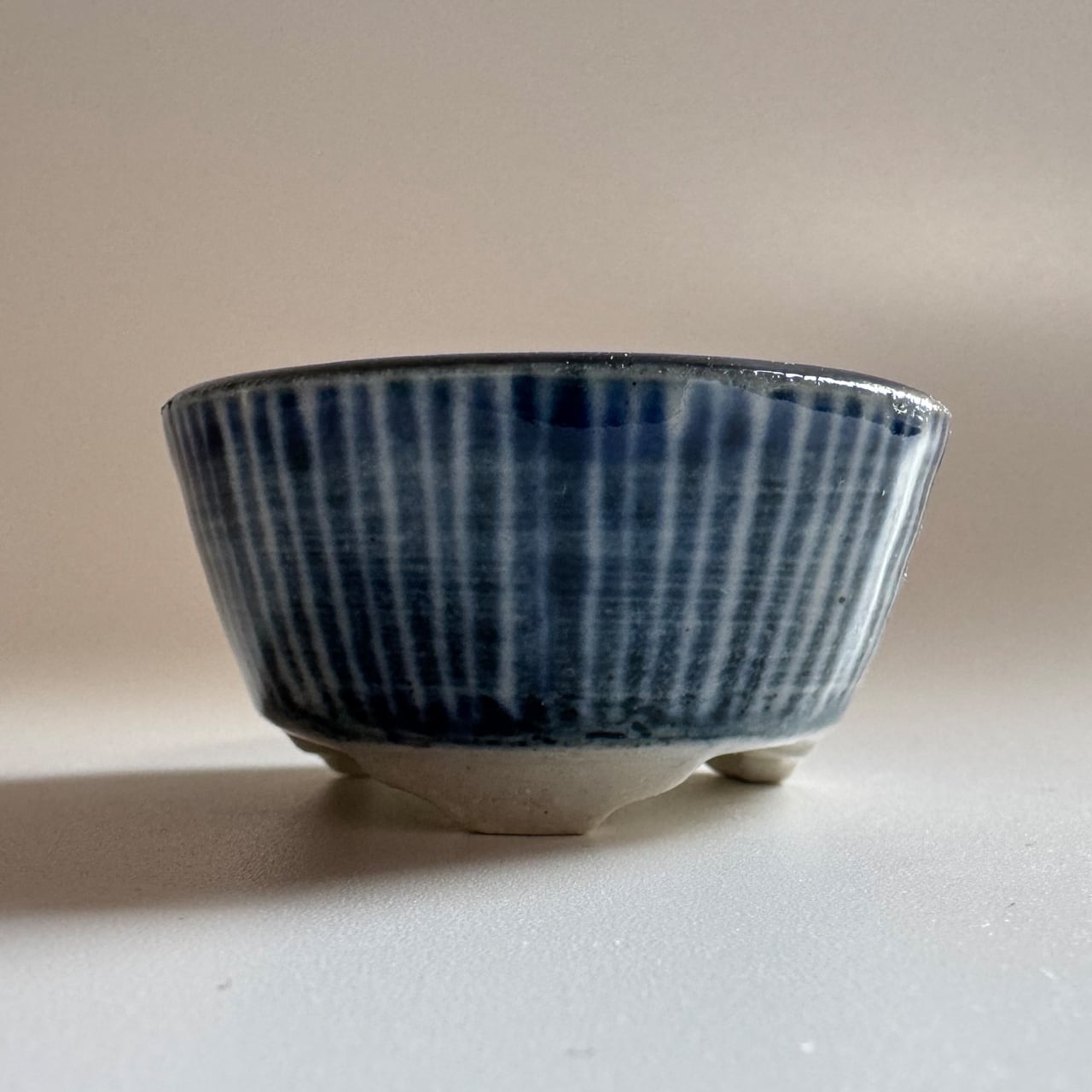 藍のシリーズ。焼いたあとに一回り小さくなるとはいえ、排水を考えて穴に向けて緩やかなカーブのある鉢を手作りする時の指先の緊張感を想像してみて欲しい一品です。鉢の表面をよく見てみると、ろくろ成形の跡があります。