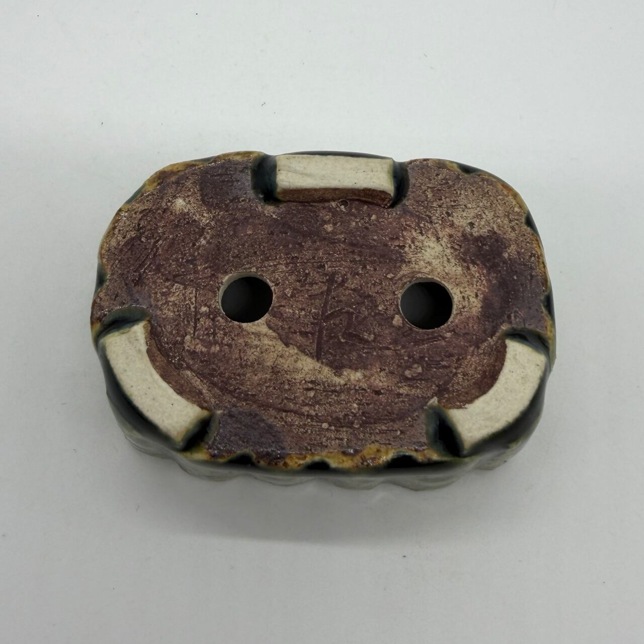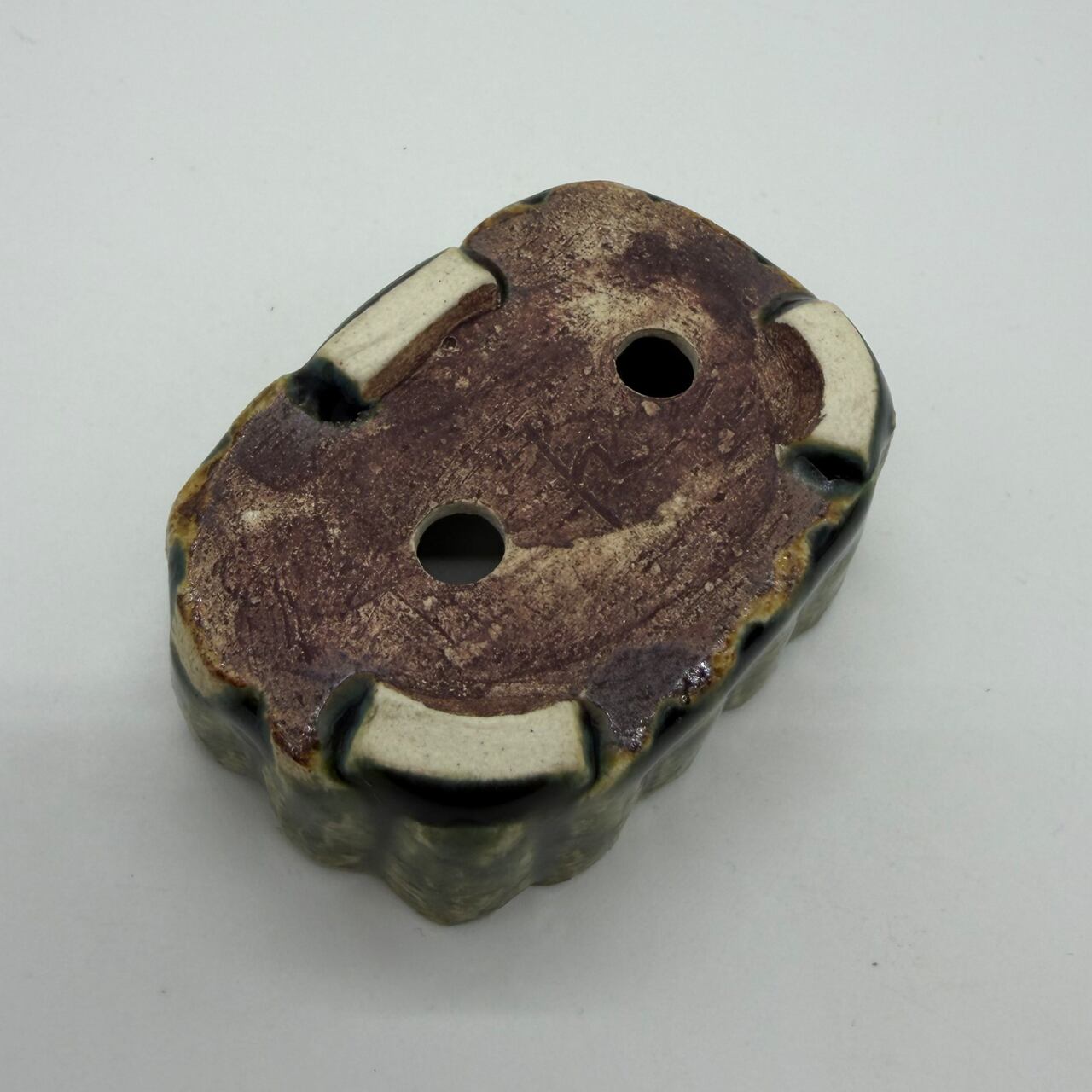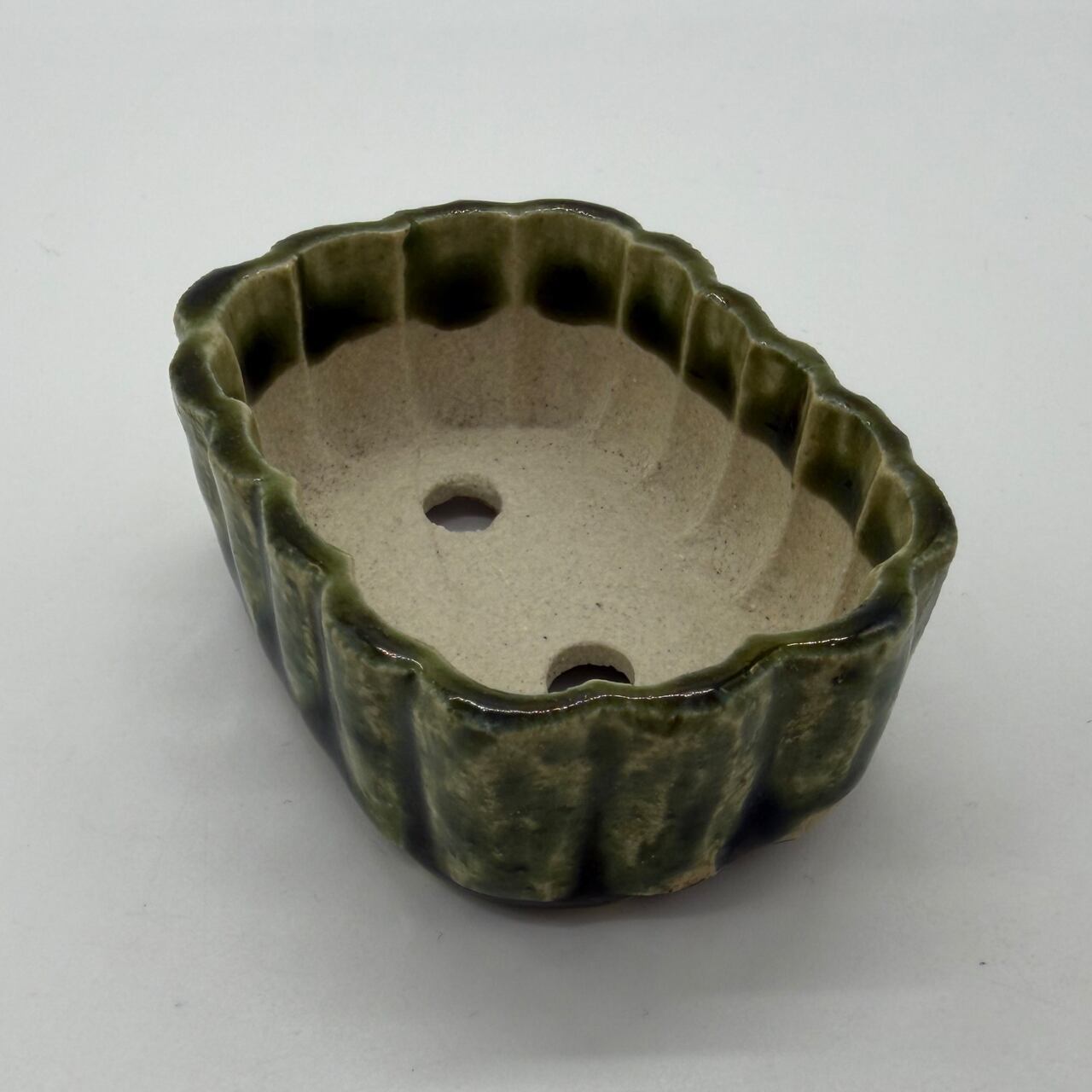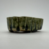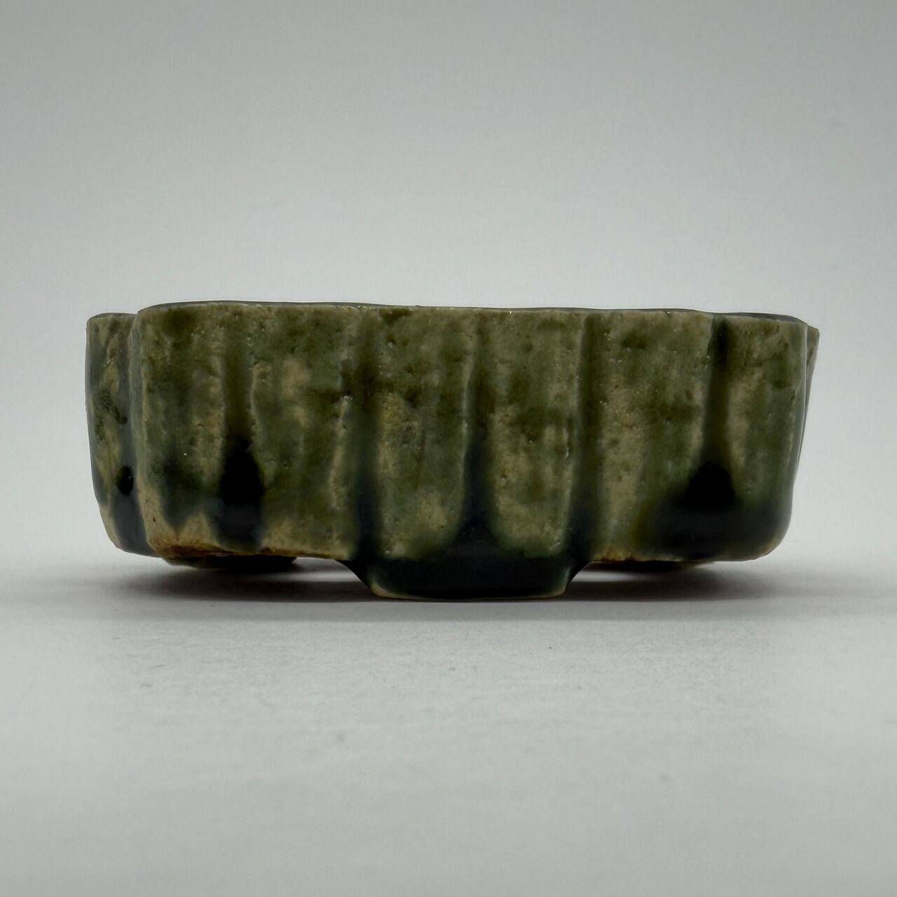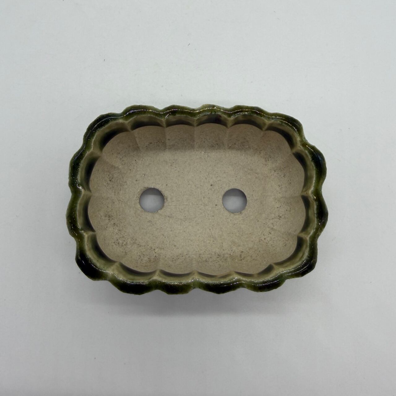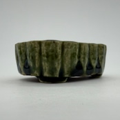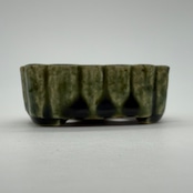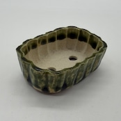 “RUSU BONSAI Pot” to directly enjoy the traditional color and the technique. Unique shape with two holes for drainage. Only one pot in stock. This deep green color is a typical color for RUSU pottery. This is the color of RUSU seen in UKIYO-E prints, and it is also this color that comes up when you search for RUSU.