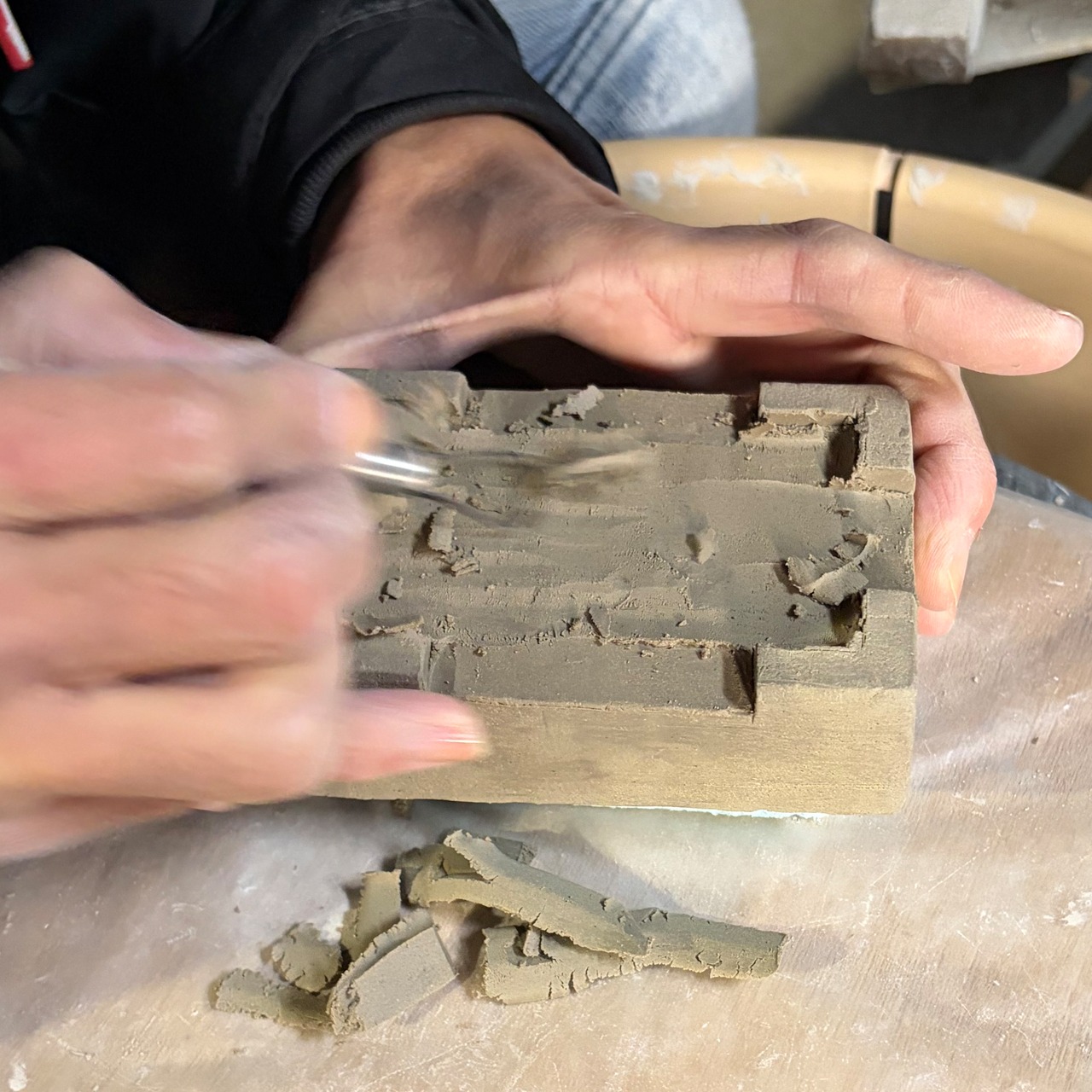 The foot is not attached separately; it is "carved out" from the main body of the piece. This means we are carving away the clay from the body other than the foot itself. This technique is used to prevent cracks or breakages. The trade-off, however, is that the process is far more labor-intensive.