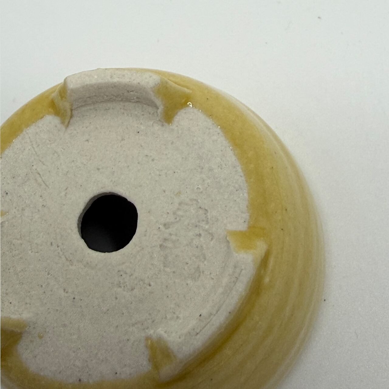 小さいながら存在感がある「BABY YELLOW 」。直径はペットボトルキャップの1.5倍ほど、正露丸のキャップと同じくらい。焼いたあとに一回り小さくなるとはいえ、ろくろを回しながら底が平たい鉢を手作りする指先の緊張感を想像してみて欲しい一品です。