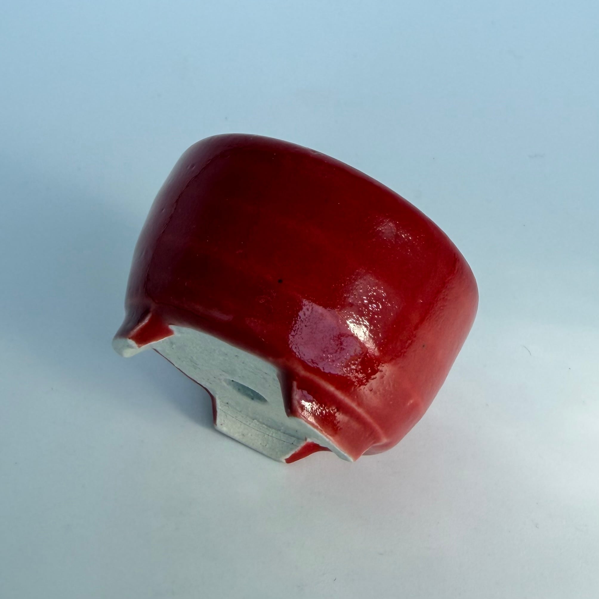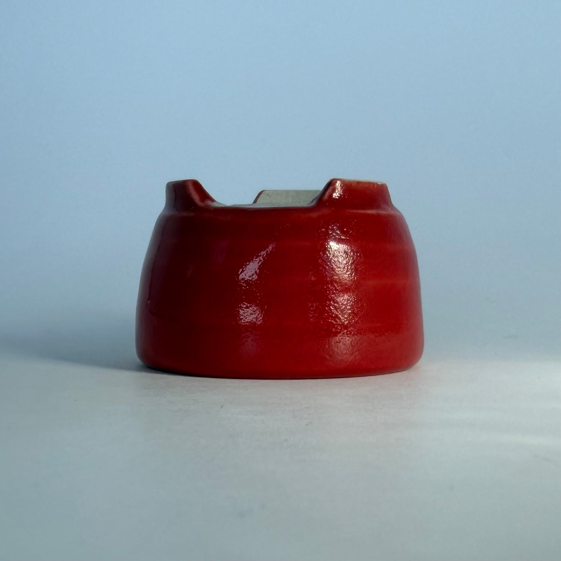 小さいながら存在感がある「BABY RED」。直径はペットボトルキャップの1.5倍ほど、正露丸のキャップと同じくらい。焼いたあとに一回り小さくなるとはいえ、ろくろを回しながら底が平たい鉢を手作りする指先の緊張感を想像してみて欲しい一品です。