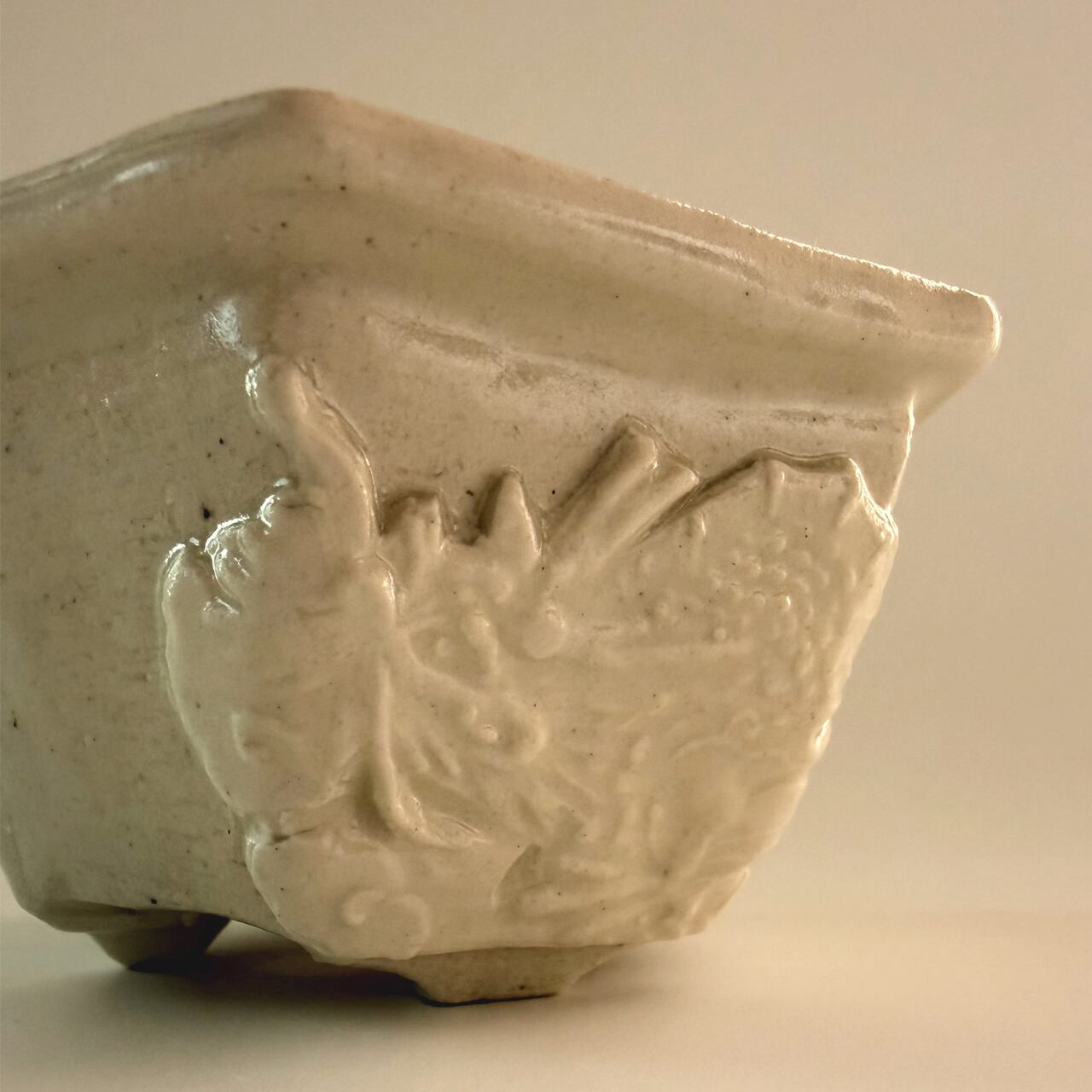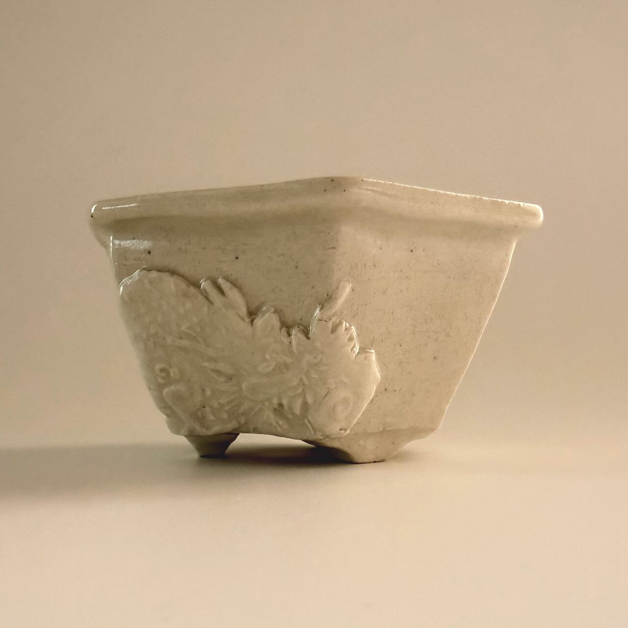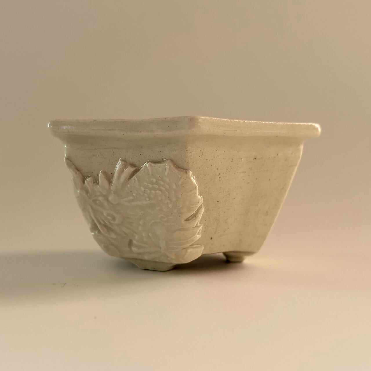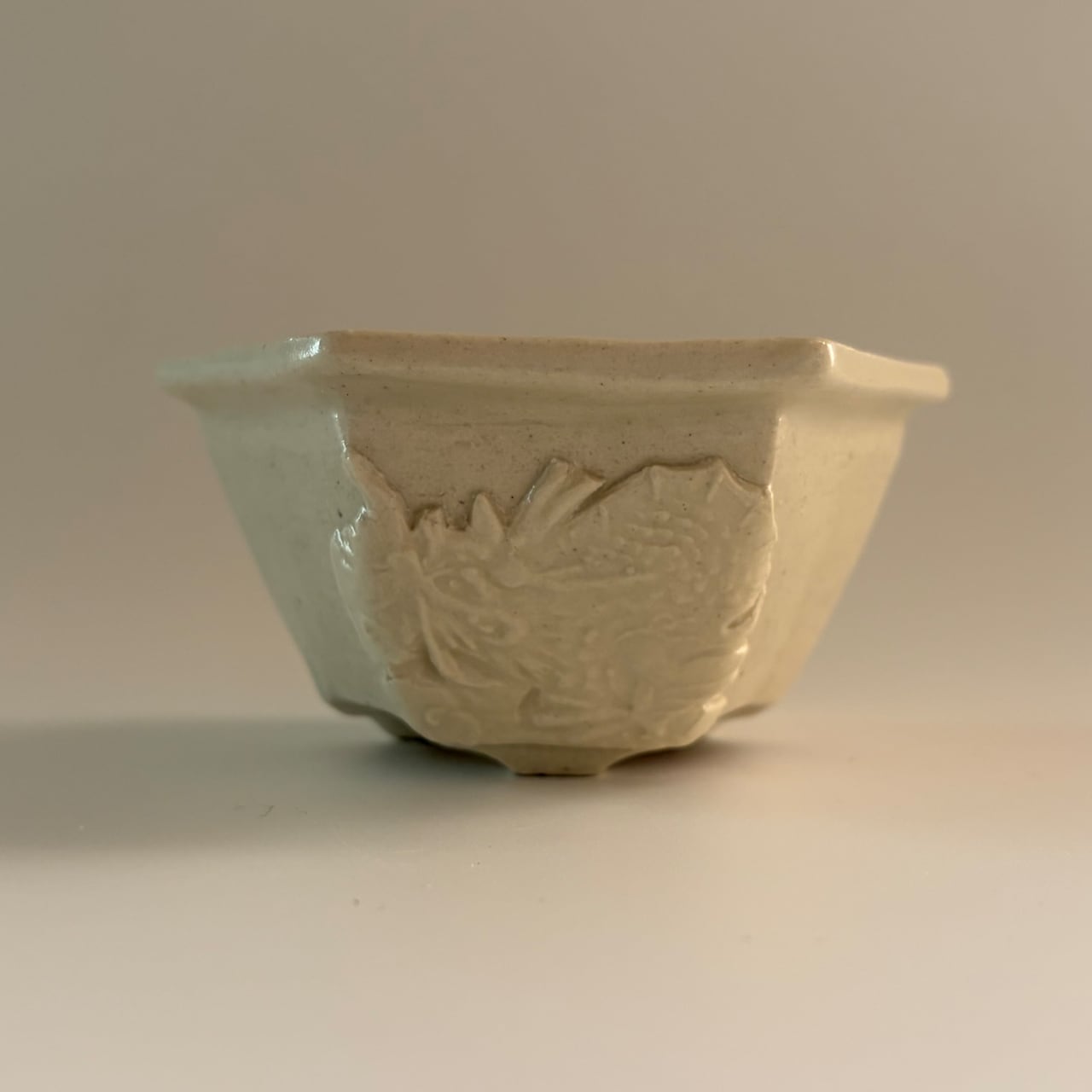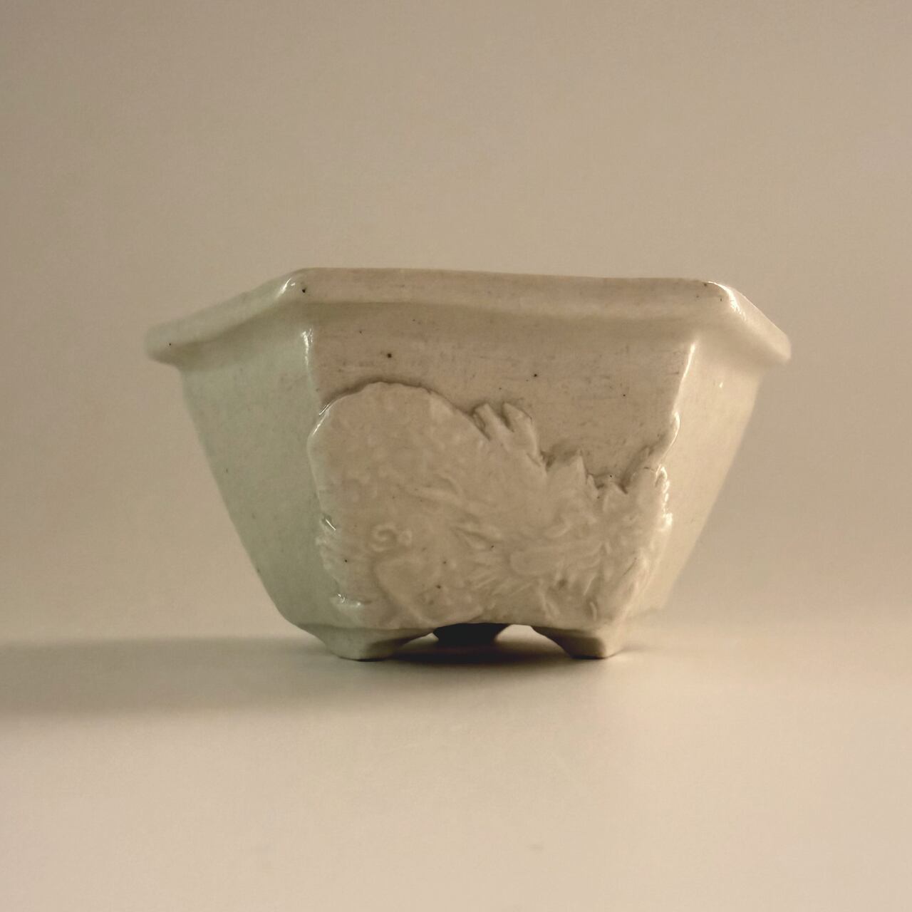 光沢を抑えた釉薬を施された鉢の側面には、2つの異なる龍の模様(貼花文)があります。