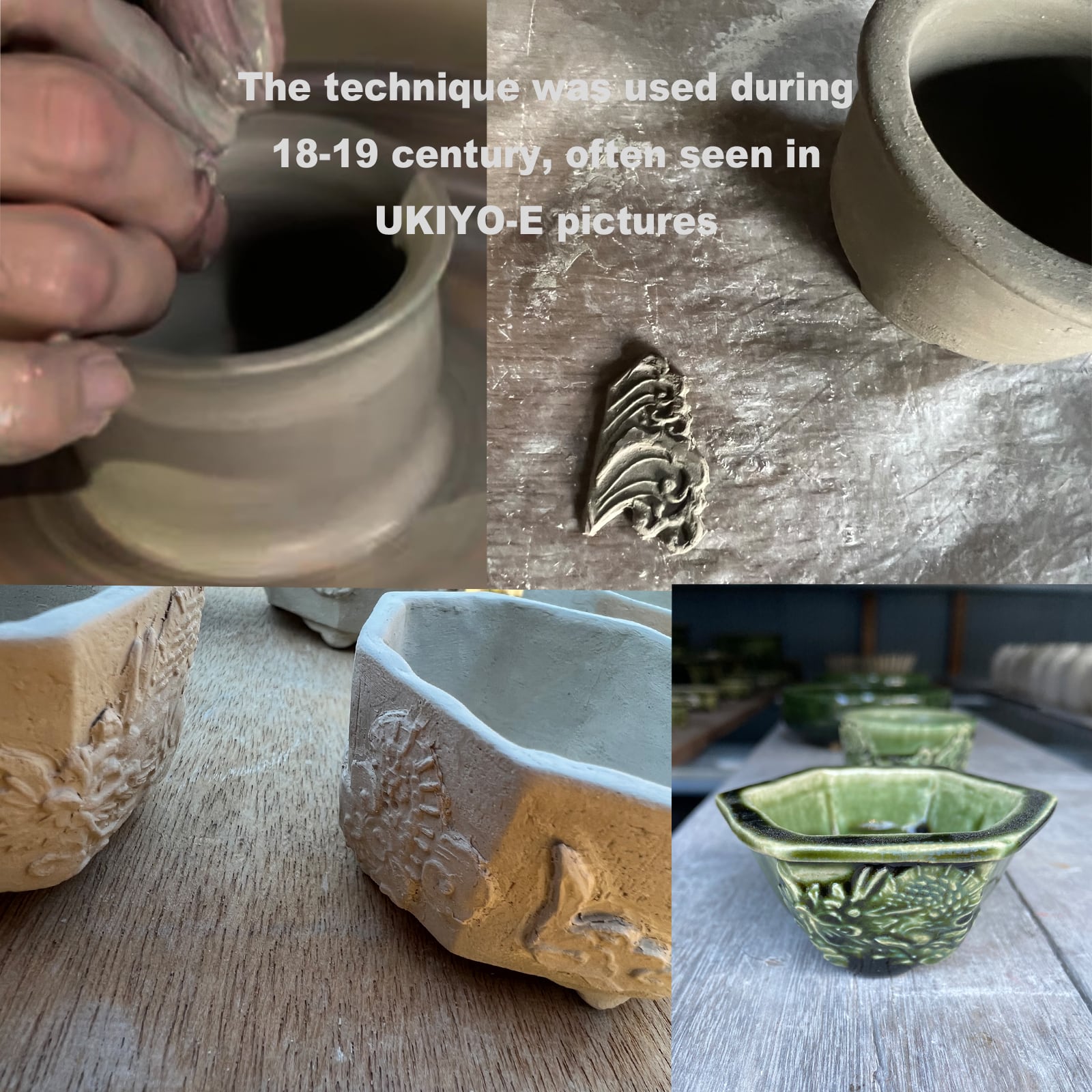 ☆「貼花文」と呼ばれる立体的な模様は、江戸時代に愛知県瀬戸市で広まった「呂宋」と呼ばれる焼き物の特徴の1つです。「呂宋」は当時とても人気の焼き物で、喜多川歌麿の浮世絵にも描かれています。